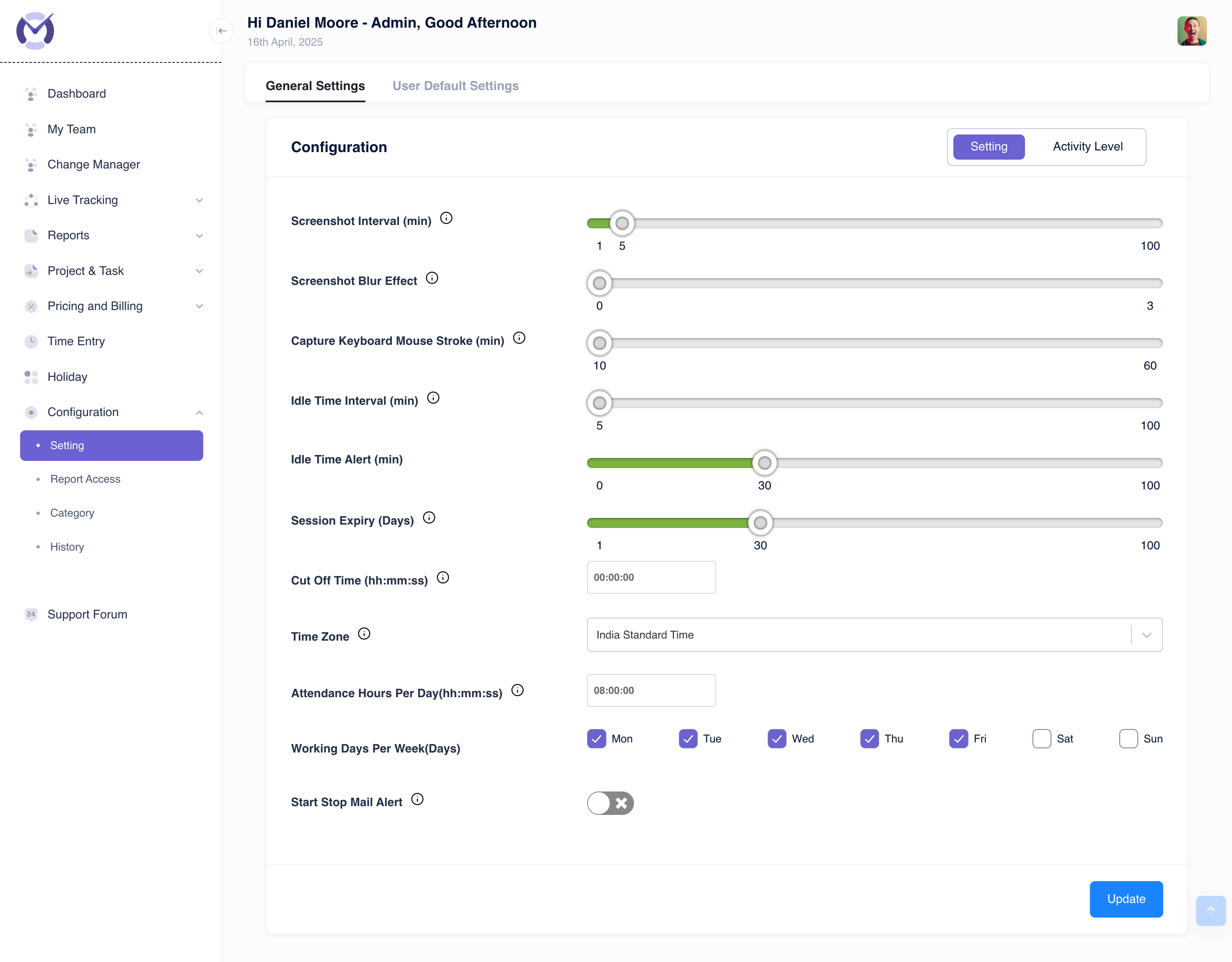 - Idle Time Interval (min): Define how long a user must be inactive before being marked as idle (slider from 5 to 100 minutes).